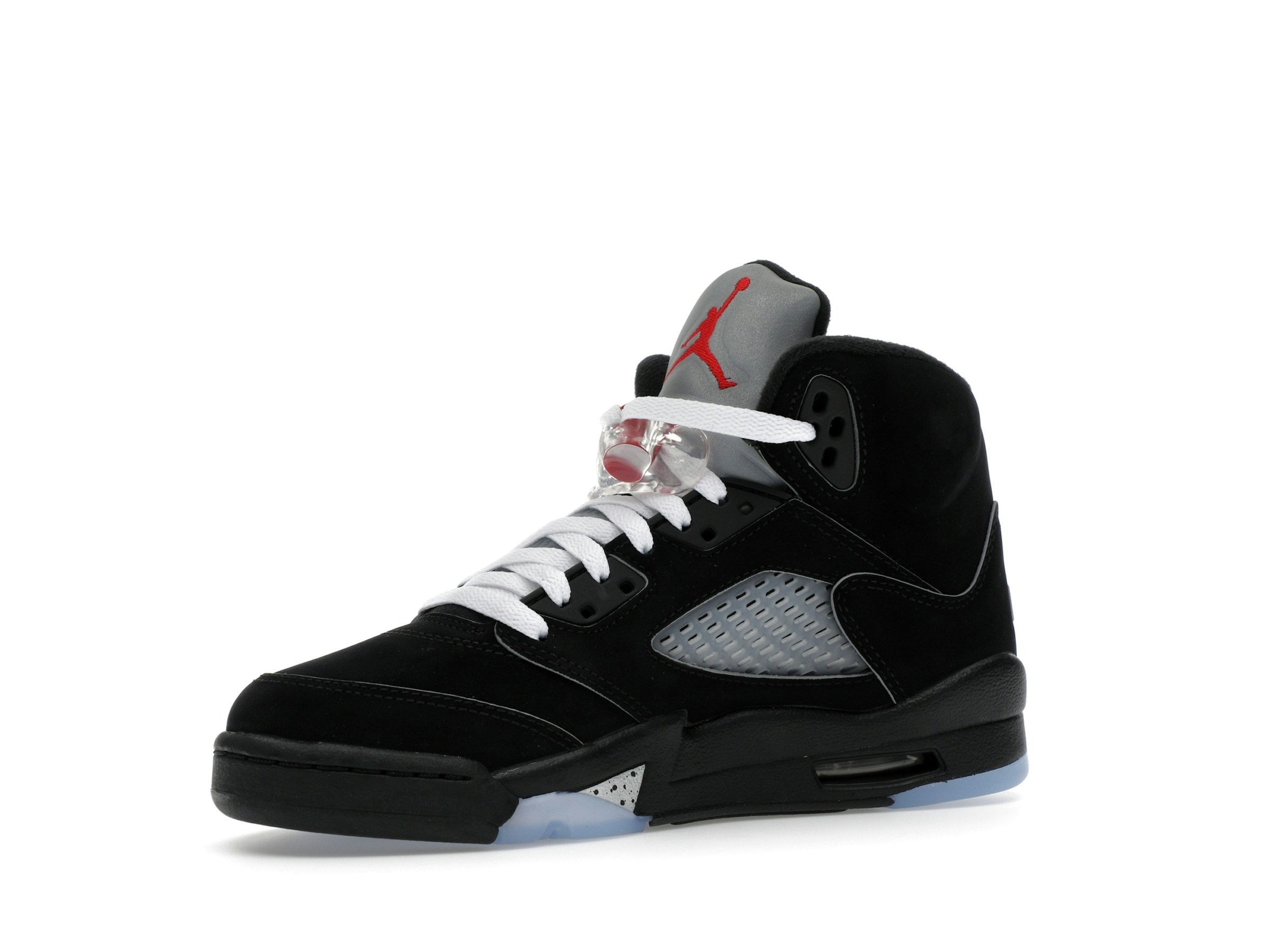 The sleek black nubuck upper is accented by a striking reflective metallic silver tongue, instantly recognizable as a signature element of the Air Jordan 5. Bold fire red Jumpman branding adds a vibrant pop of color, while the metallic silver shark teeth on the midsole and translucent netting maintain the shoe’s iconic aesthetic.